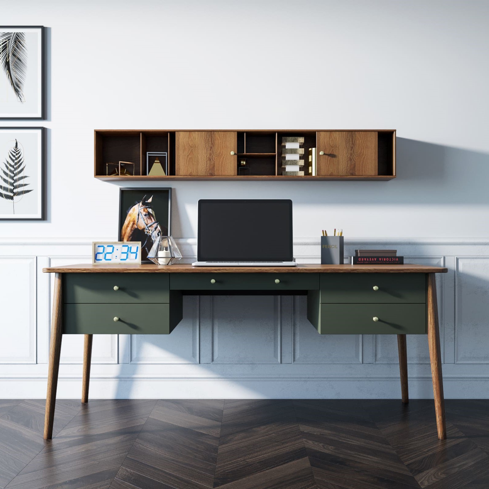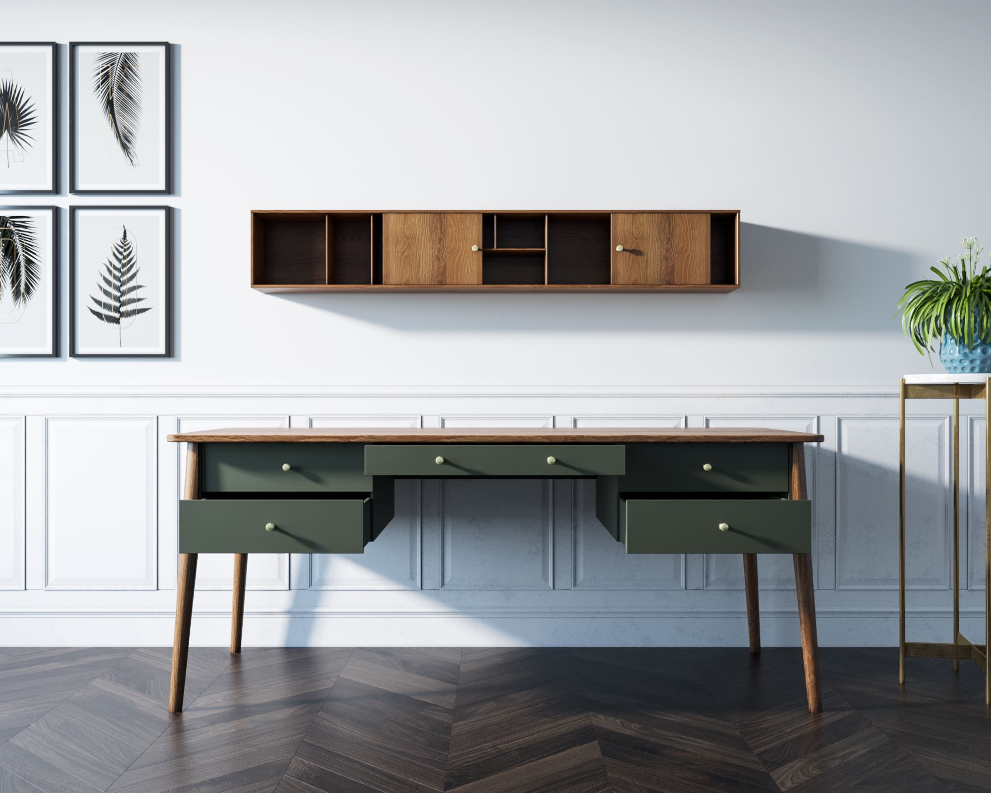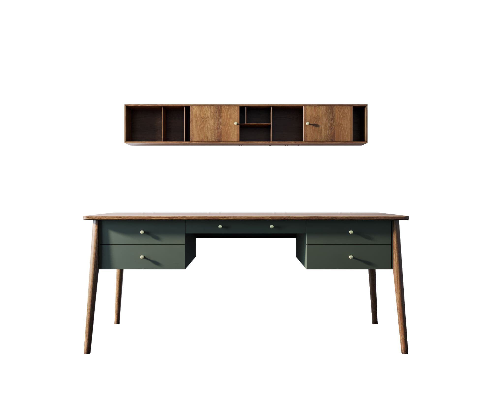 Фасады имеют приятный зеленый оттенок. Корпус стола выполнен из шпона ясеня. Ножки-массив ясеня.