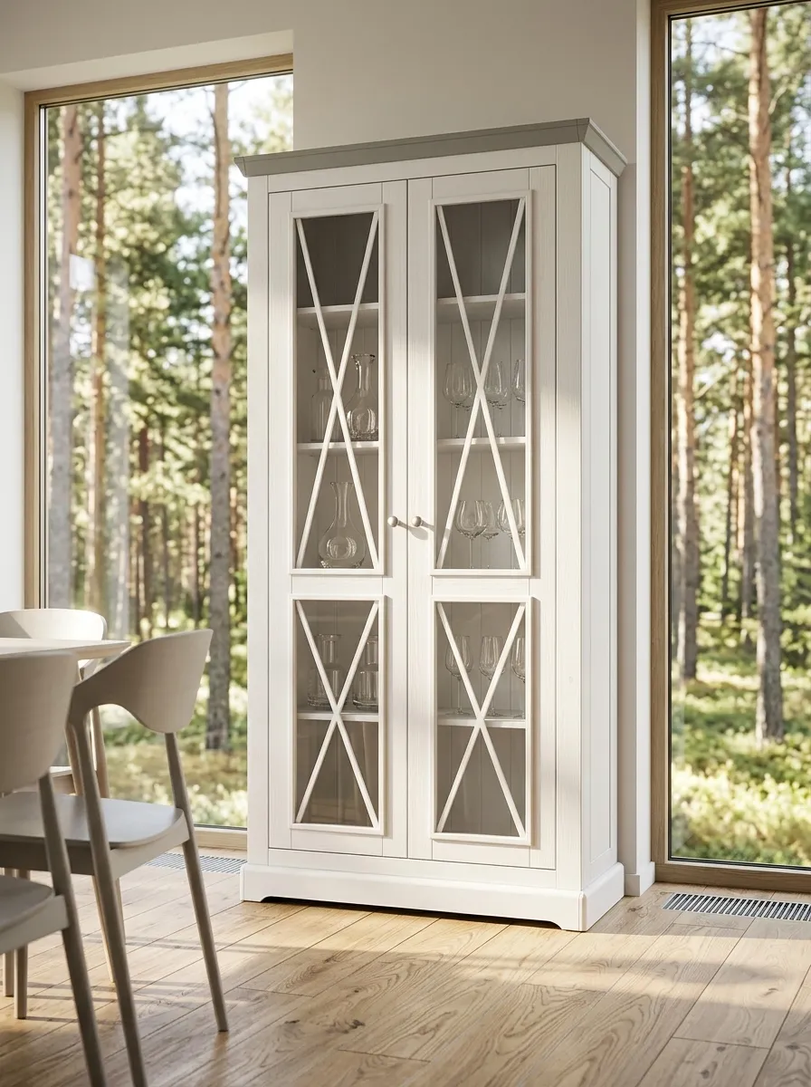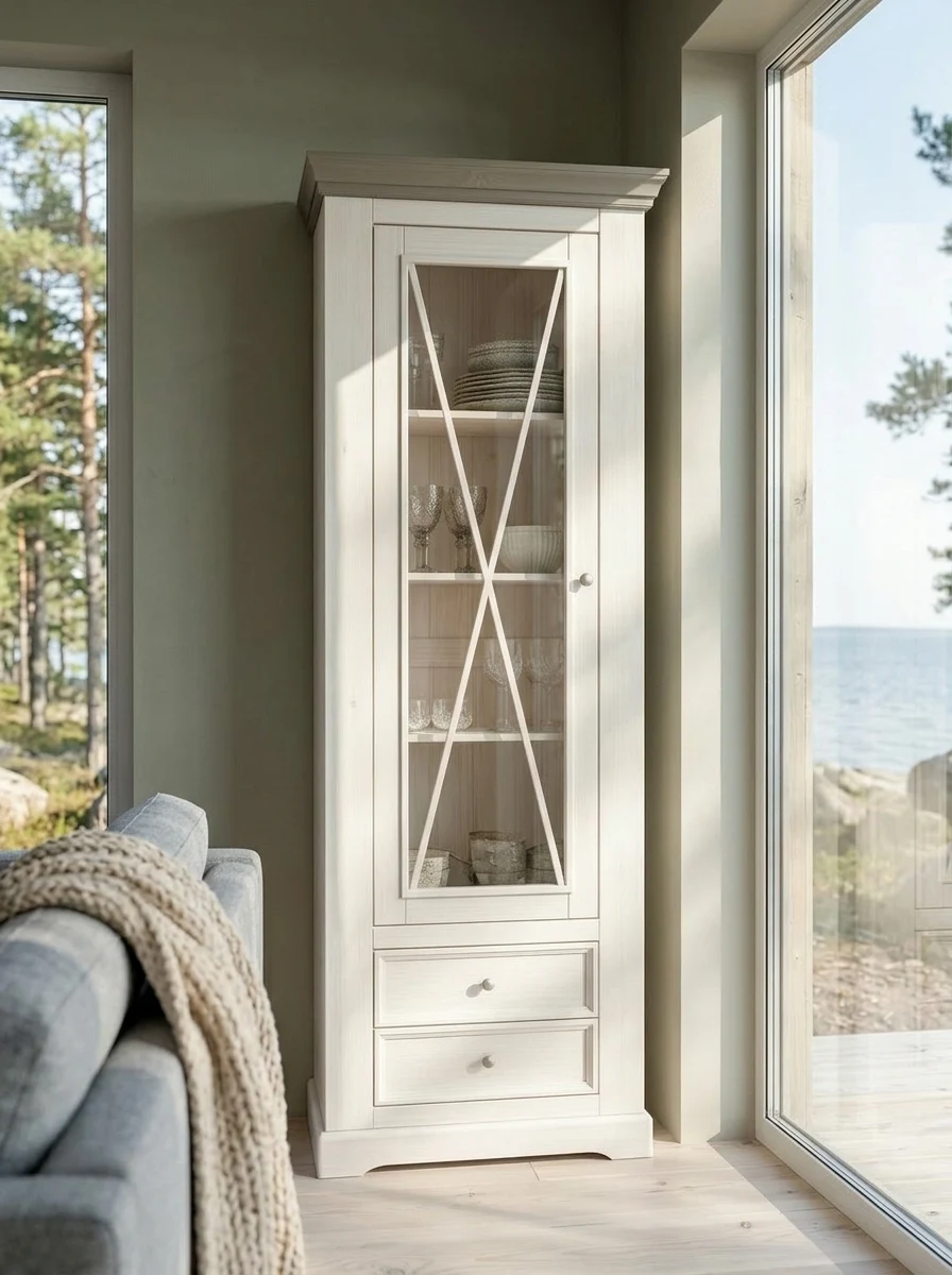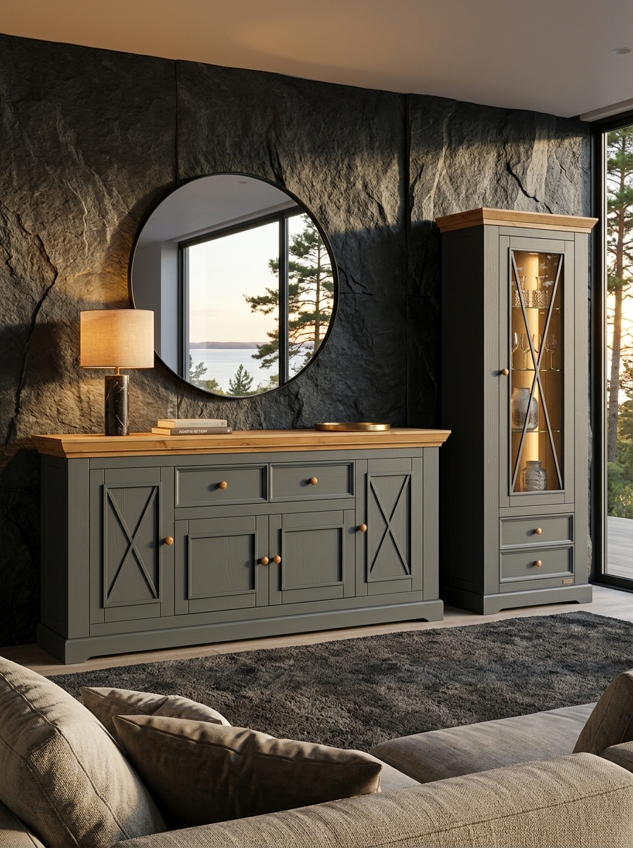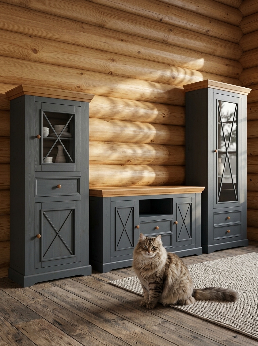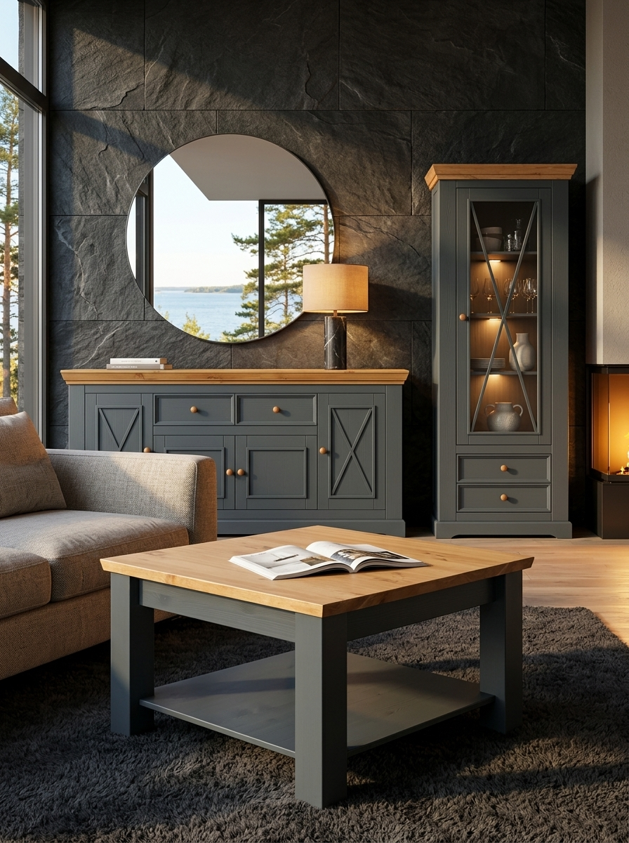 В коллекцию входят обеденные и журнальные столы, комоды, шкафы, стулья, тумбы ТВ, навесные полки, стеллажи и сундуки для кухни, спальни, гостиной комнаты, библиотеки и прихожей. Мебель изготавливается из натурального дерева – массива сосны, окрашивается в два цвета – белый воск/антрацит и серый 7012/бейц-масло.