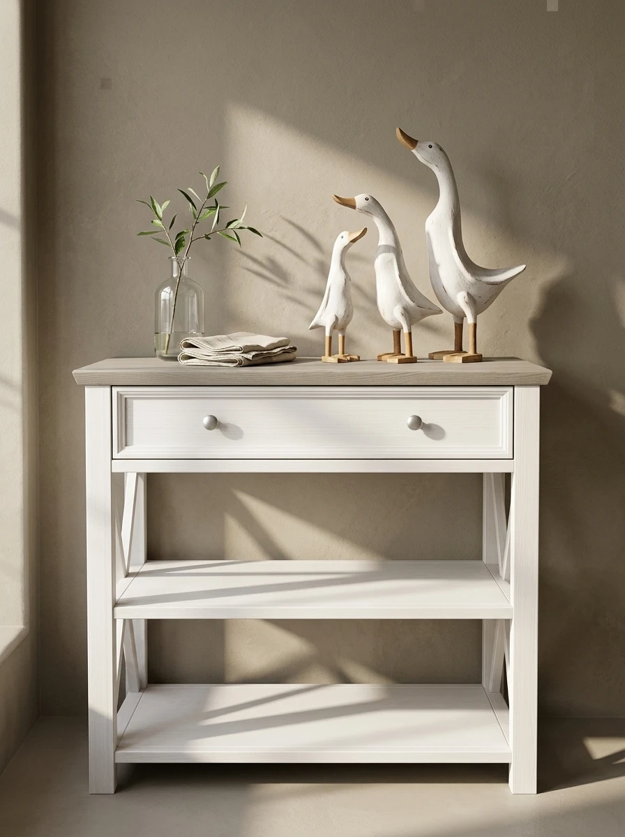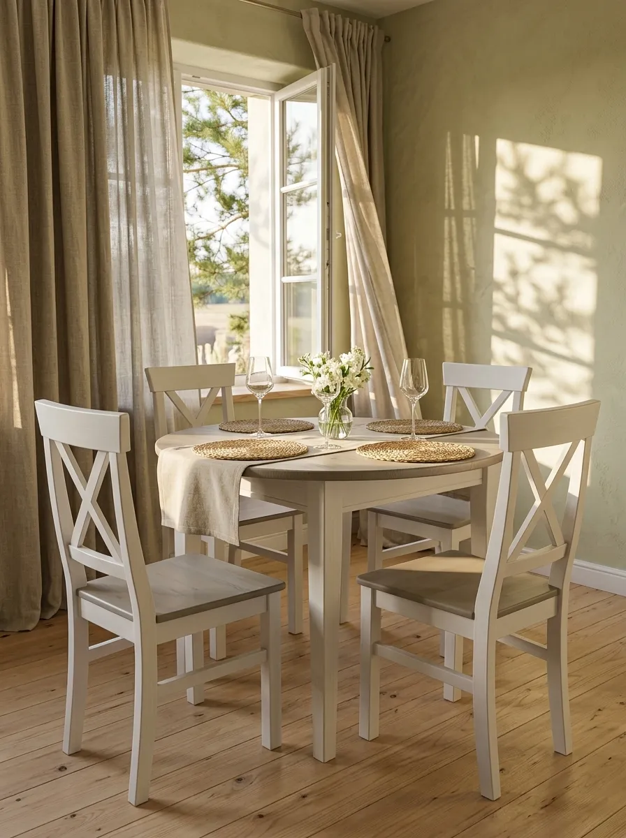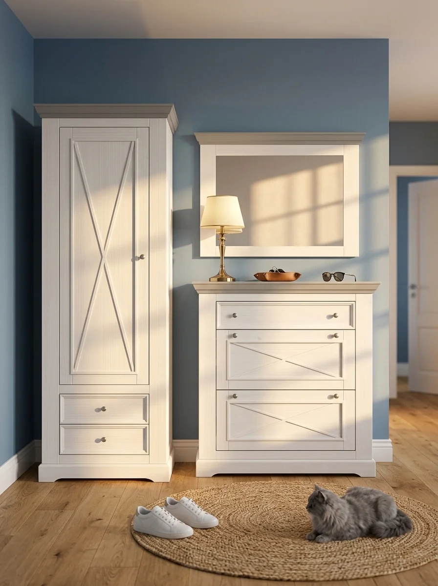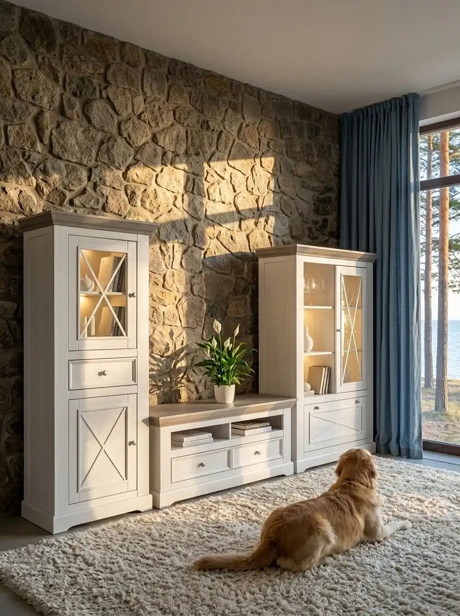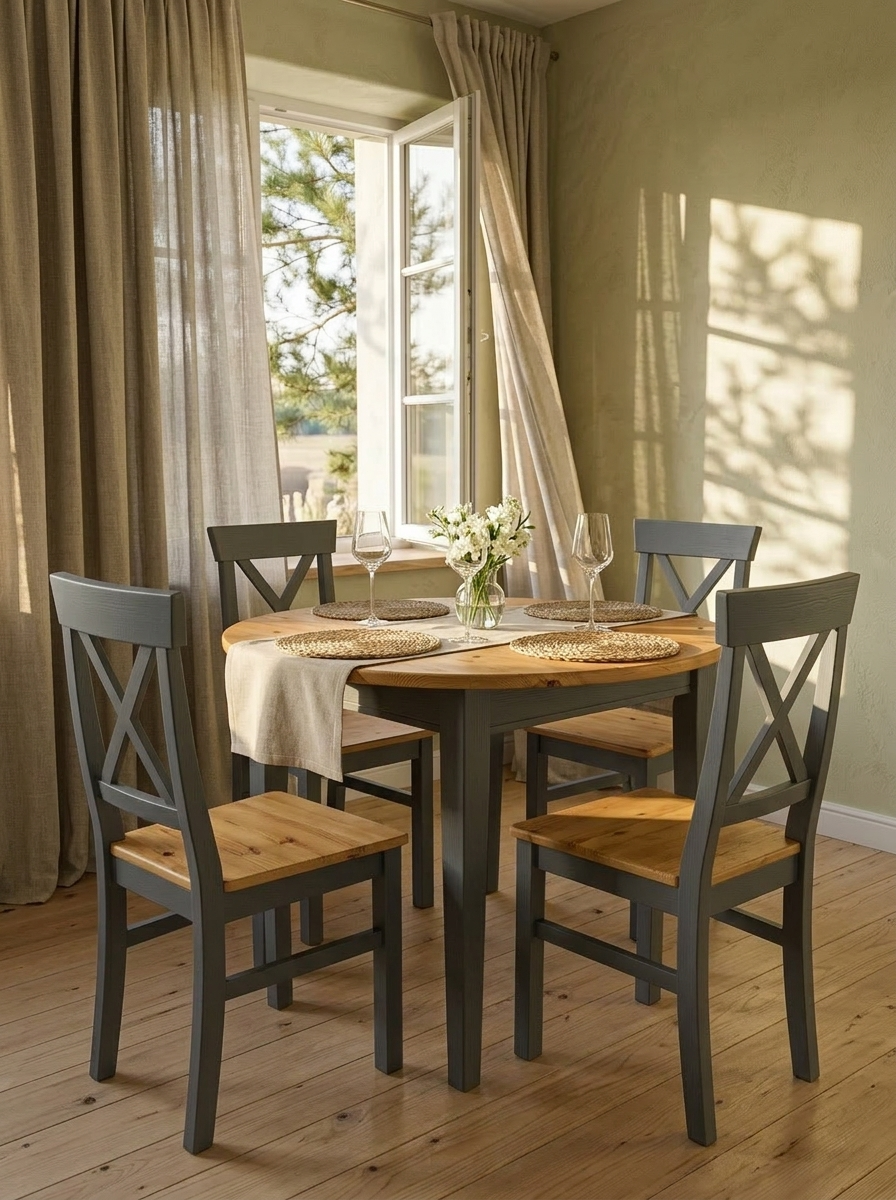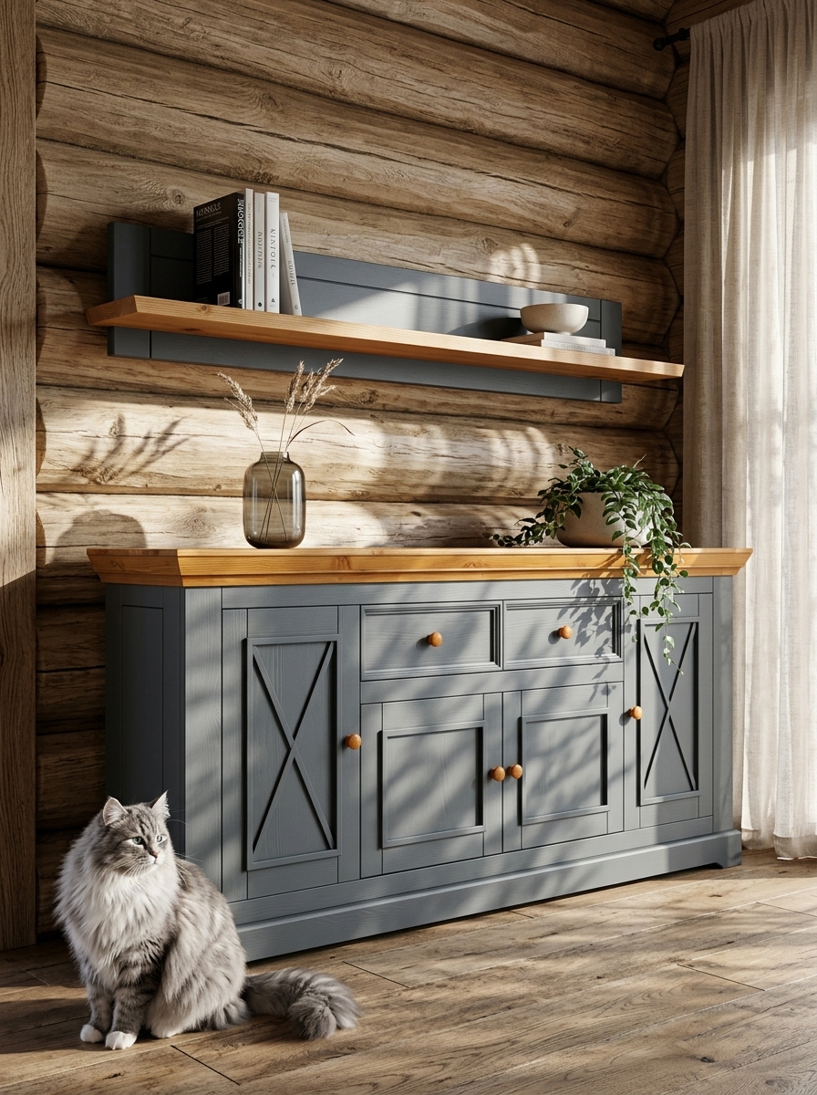 В коллекцию входят обеденные и журнальные столы, комоды, шкафы, стулья, тумбы ТВ, навесные полки, стеллажи и сундуки для кухни, спальни, гостиной комнаты, библиотеки и прихожей. Мебель изготавливается из натурального дерева – массива сосны, окрашивается в два цвета – белый воск/антрацит и серый 7012/бейц-масло.