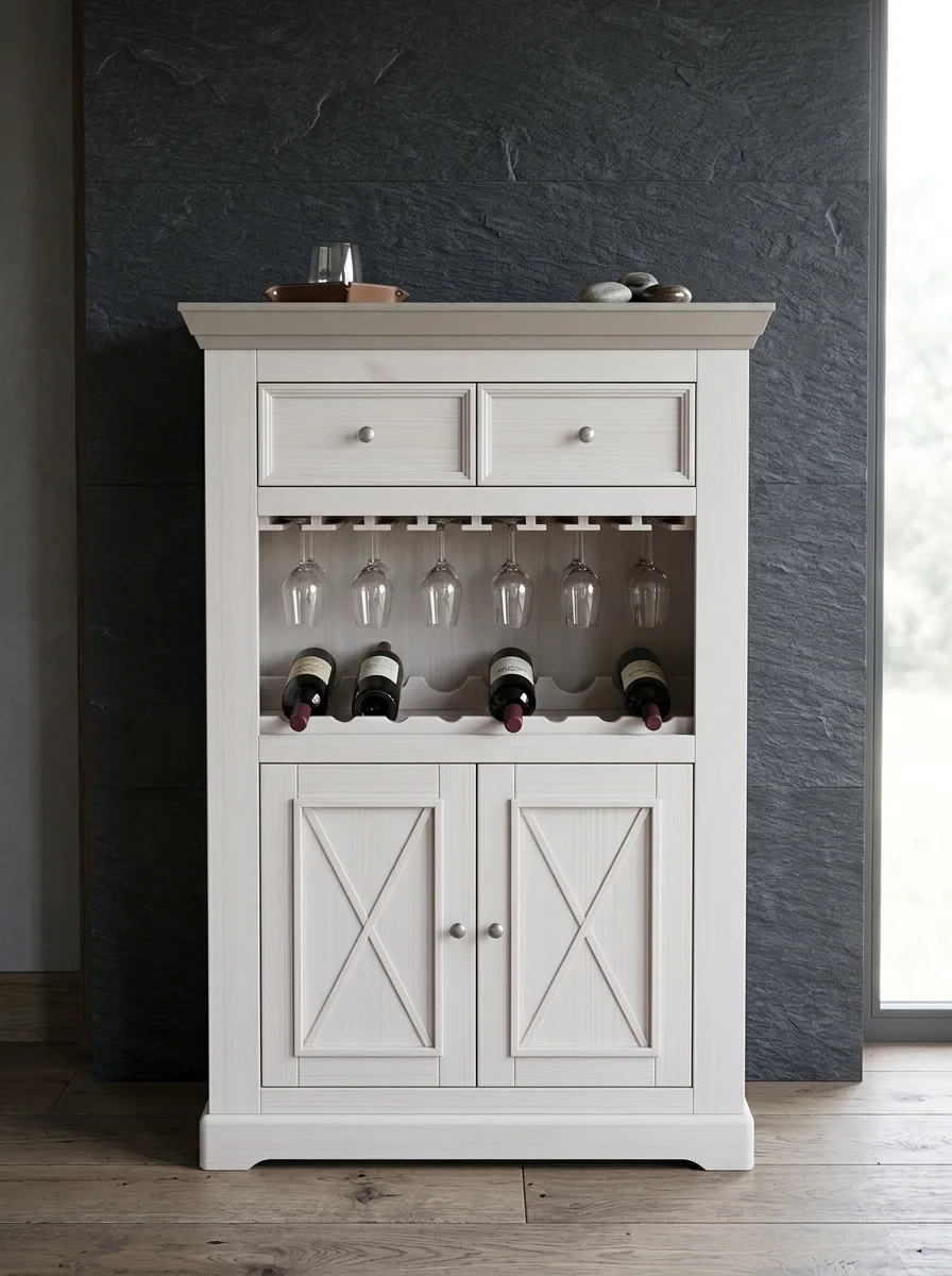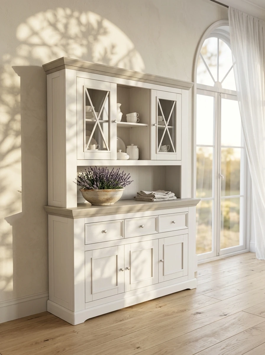 Производитель предлагает раскладные и нераскладные столы, глухие и сквозные стеллажи, комоды с откидными и распашными дверцами, с маленькими и большими ящиками. Выдвижные ящики оснащаются роликовыми направляющими Hafele. Мебель комплектуется круглыми ручками-кнопками в отделке «состаренное серебро».