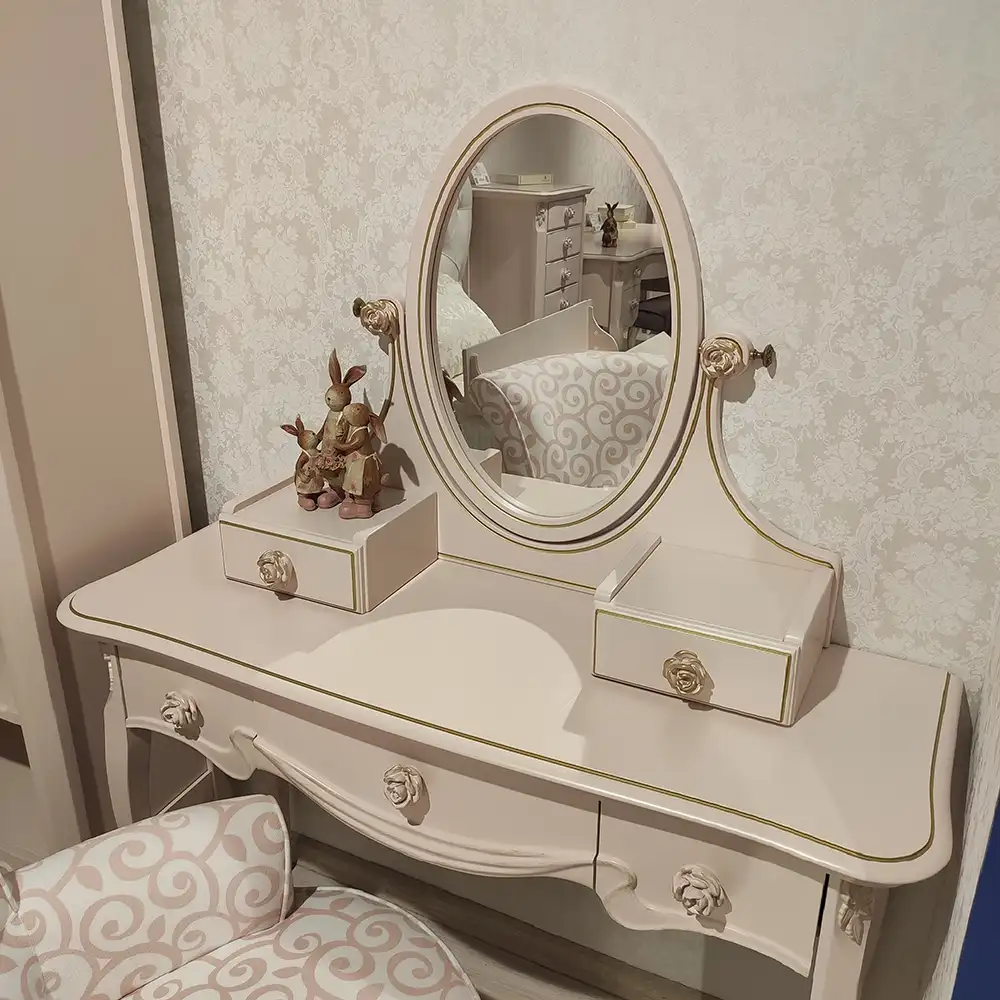 Коллекция мебели для спальни в цвете «слоновая кость с патиной». Возможна окраска в другие цвета: шоколад, розовая пудра, серо-бежевый, светло-бежевый, серо-коричневый, сланцево-серый, черный и т. д. В коллекцию входят прикроватные тумбы, шкафы для одежды, бельевые и обувные комоды, тумбы, консоли, серванты, библиотеки. Ручки и накладки на торцах сделаны в виде розовых бутонов.
