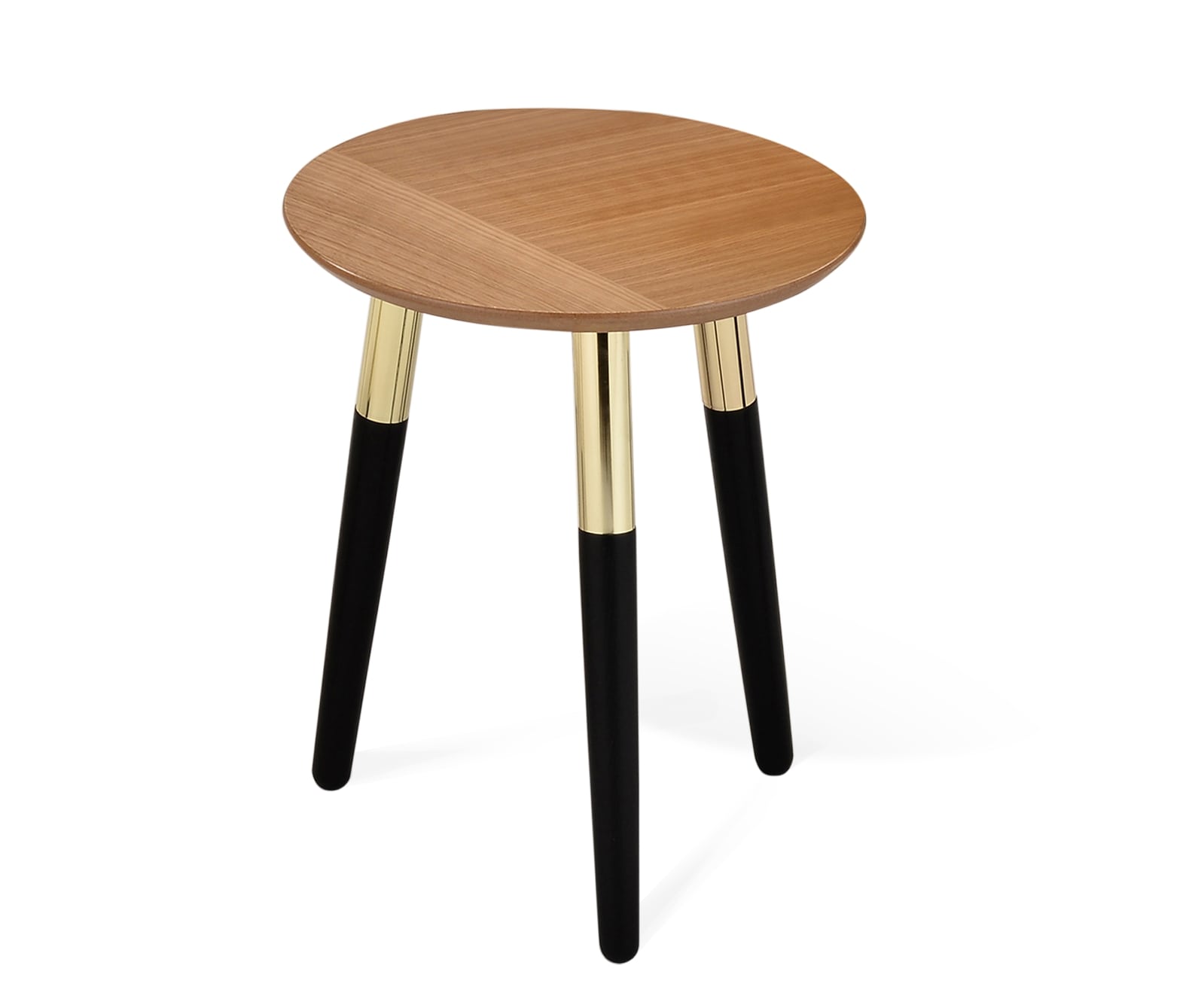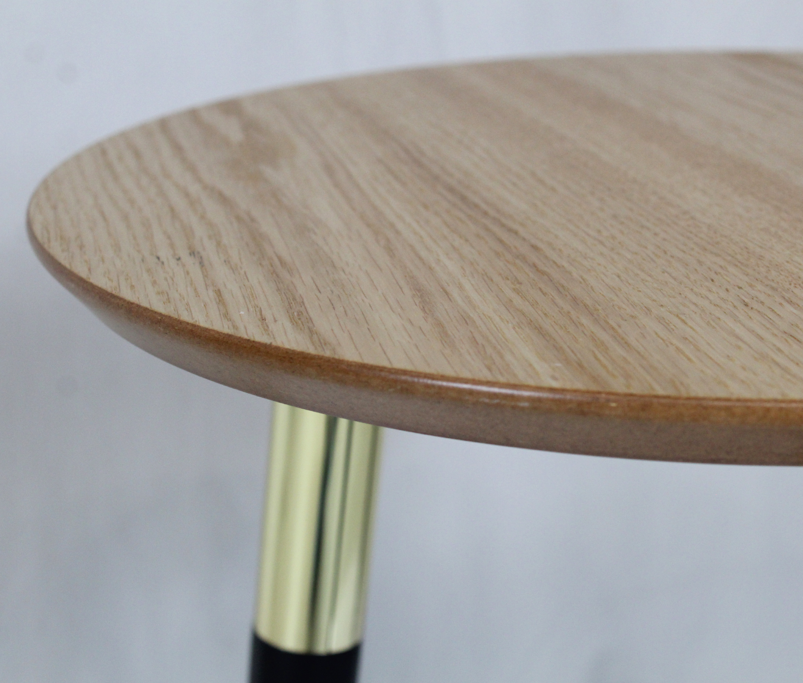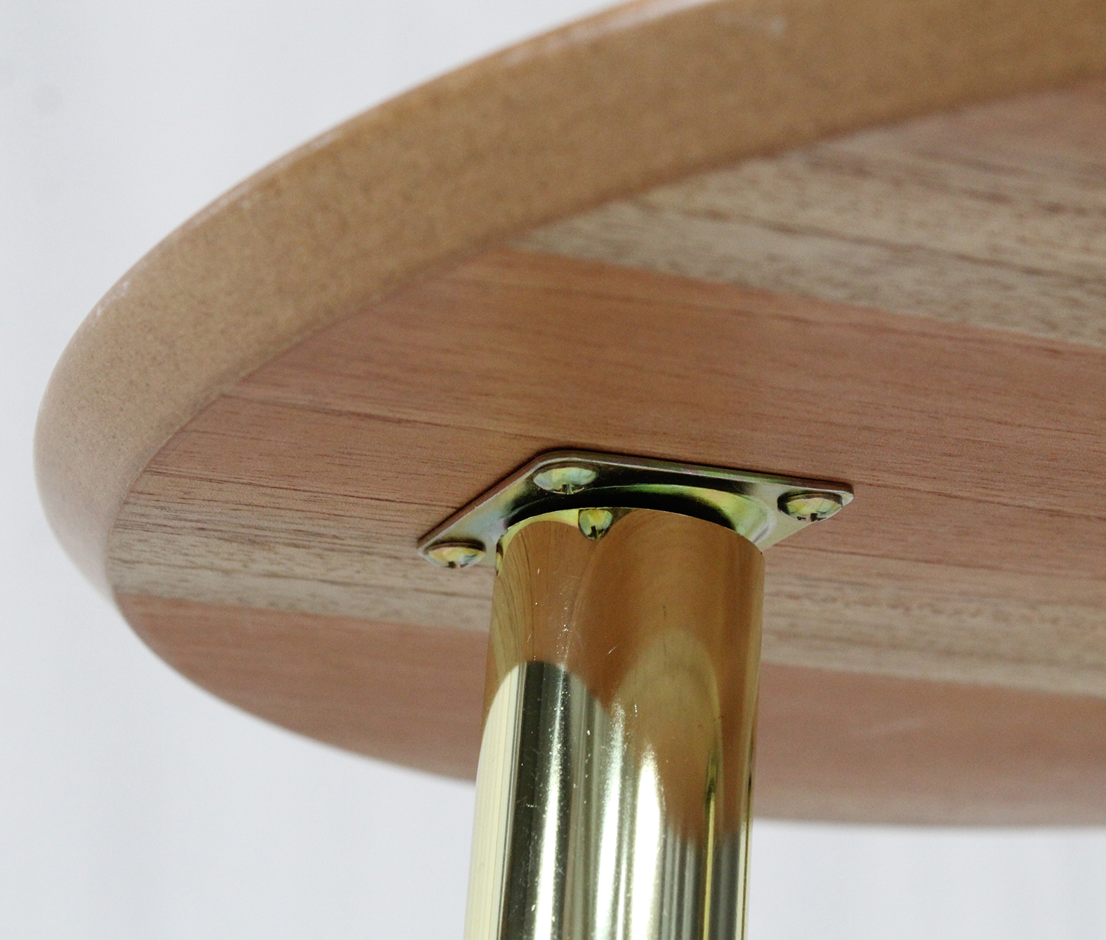 Столешница из МДФ смотрится тонкой и невесомой, поскольку имеет скошенный переход от лицевой поверхности к обратной. Диаметр столешницы 400 мм, толщина 17 мм. Рисунок под натуральное дерево добавит естественности и натуральности в интерьер. Золотой оттенок металла на ножках сделает красивый акцент в помещении.