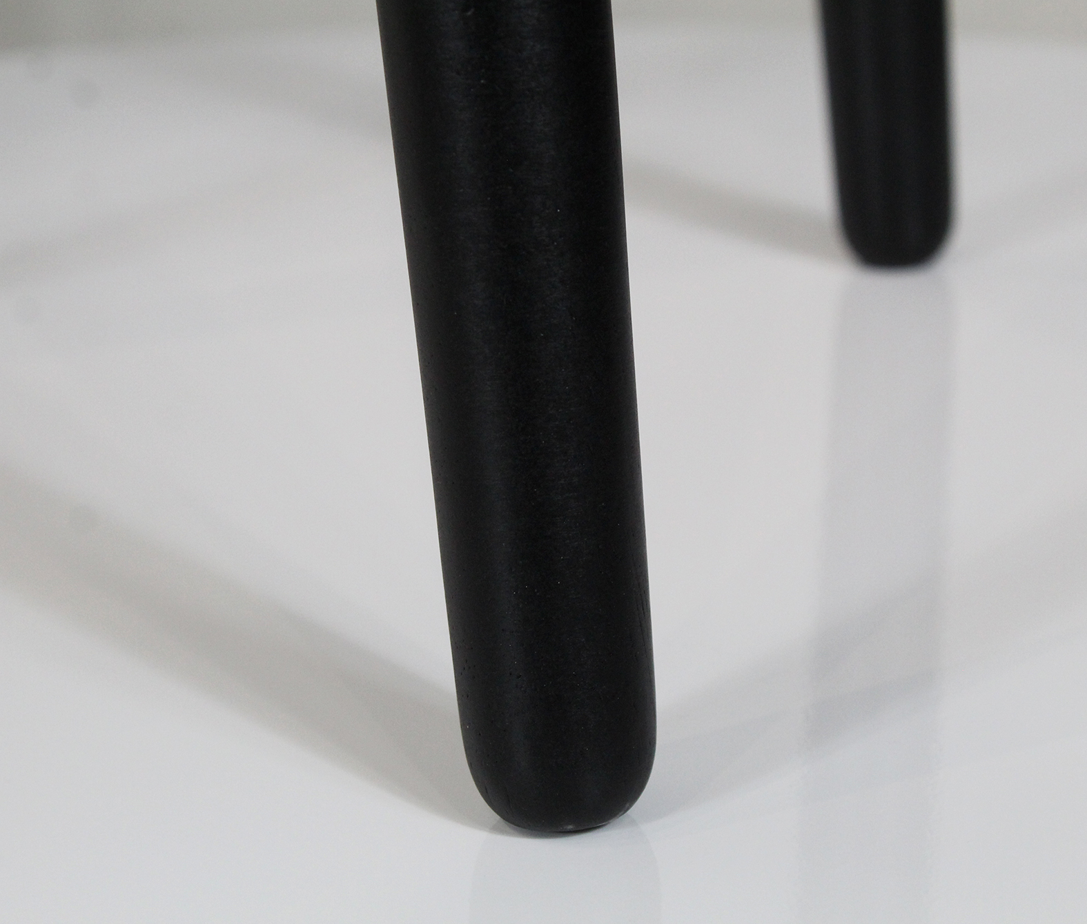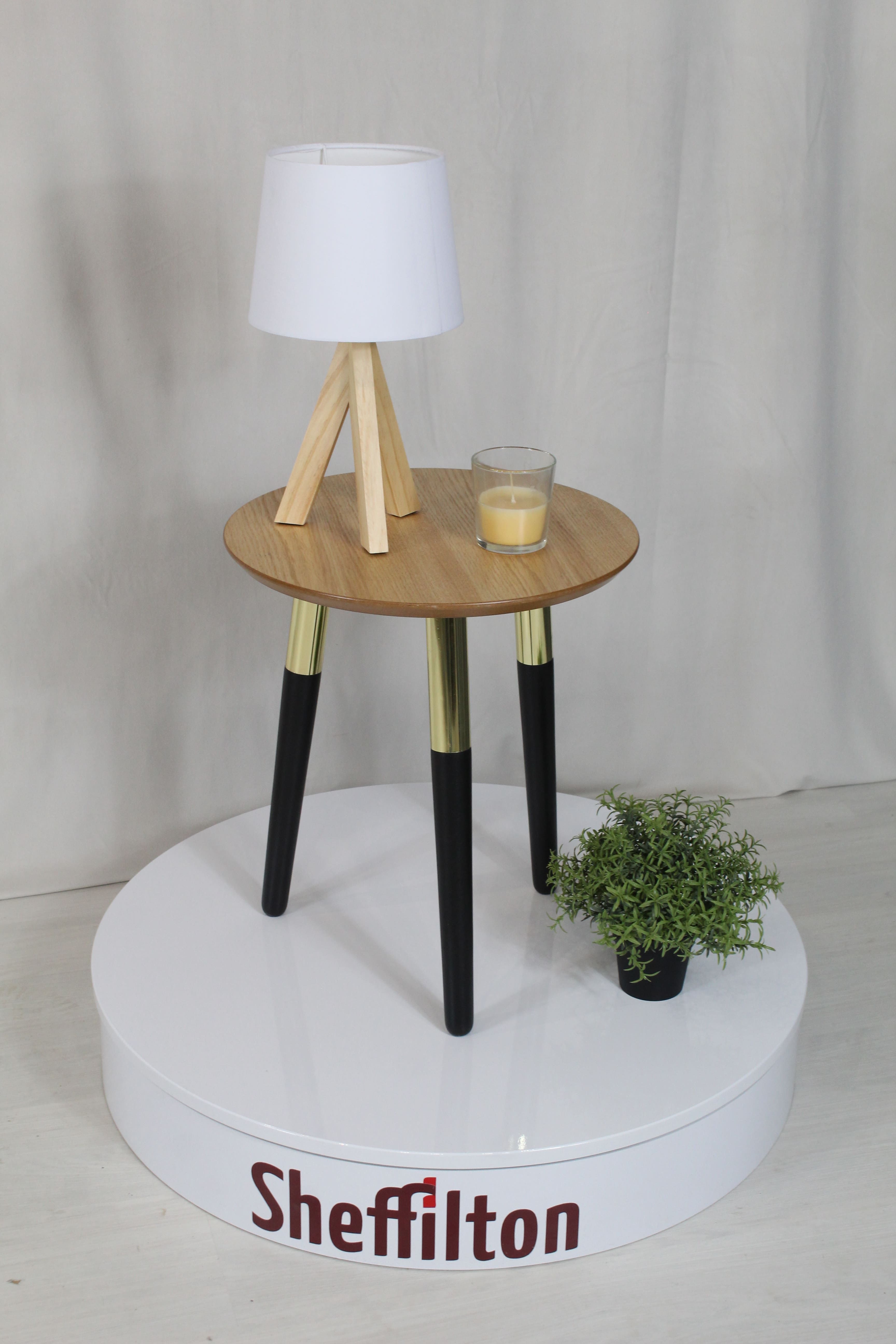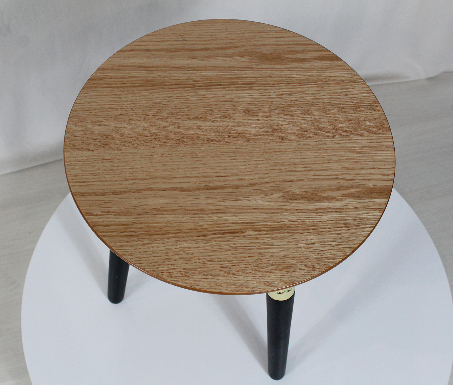 Столешница из МДФ смотрится тонкой и невесомой, поскольку имеет скошенный переход от лицевой поверхности к обратной. Диаметр столешницы 400 мм, толщина 17 мм. Рисунок под натуральное дерево добавит естественности и натуральности в интерьер. Золотой оттенок металла на ножках сделает красивый акцент в помещении.