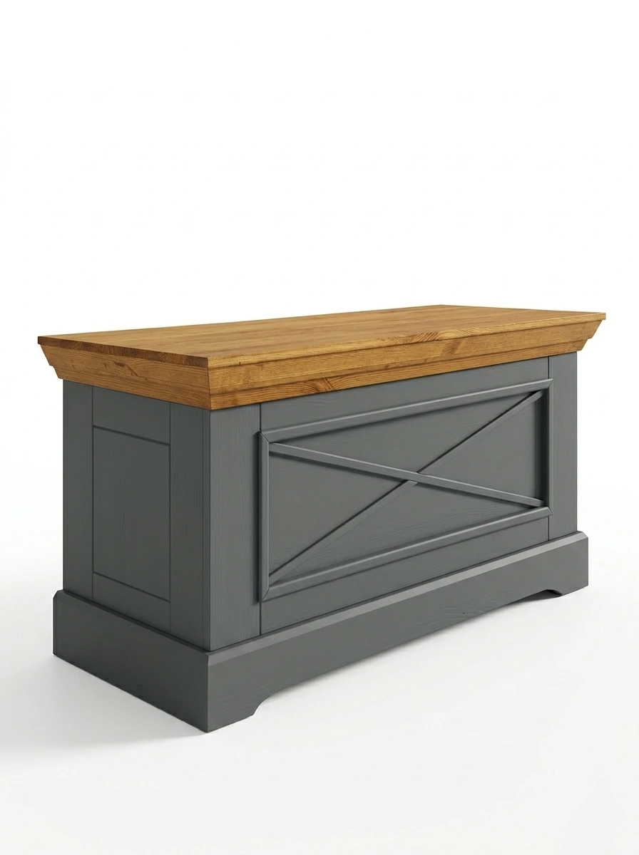 Цоколь сундука массивный и надёжный, покрыт матовым лаком, который имеет знак эко-качества «Скандинавский лебедь» и соответствует требованиям Европейского стандарта EN 71-3. Поставляется в цвете «серый7012/бейц масло». Комбинация цвета подразумевает отделку крышки сундука в цвет «бейц масло», остальная часть изделия в цвете «серый 7012(графит)». Структура дерева слегка просвечивает.