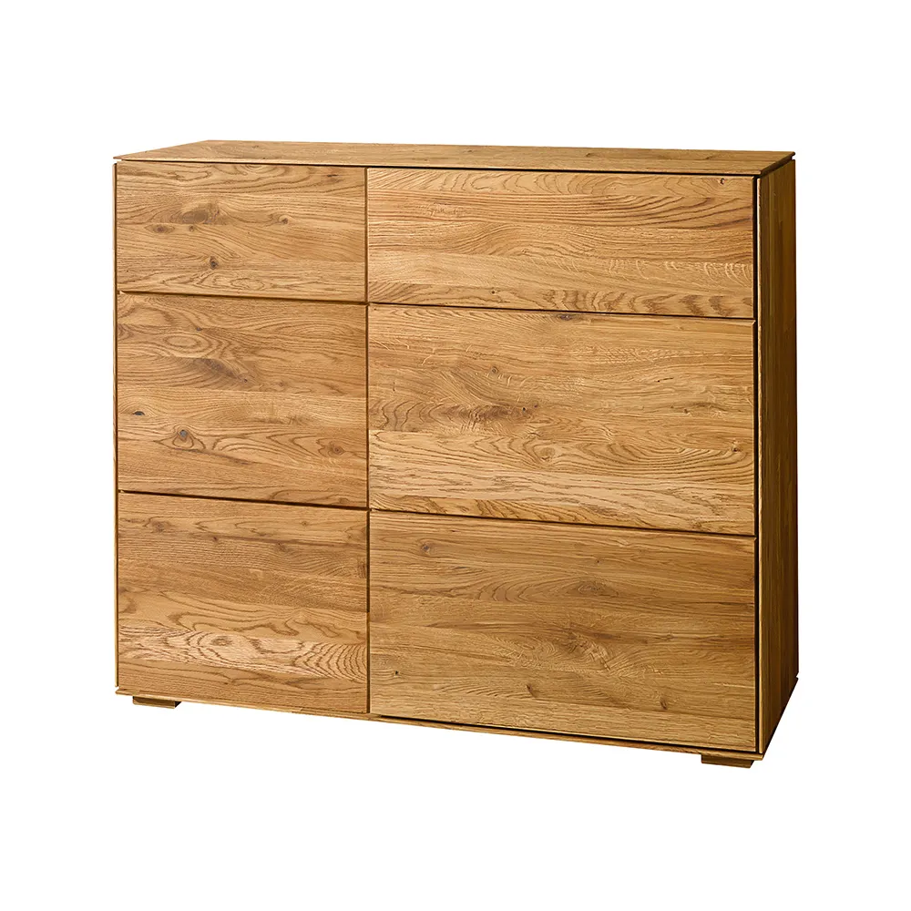 Комод «Комбо 8.1» изготовлен из натурального природного материала – массива дуба. Задняя стенка сделана из шпонированной фанеры. Для отделки предлагается шесть тонов, на выбор: бейц-масло, дуб паркетный, дуб отбеленный, дуб венге, темная вишня, итальянский орех.