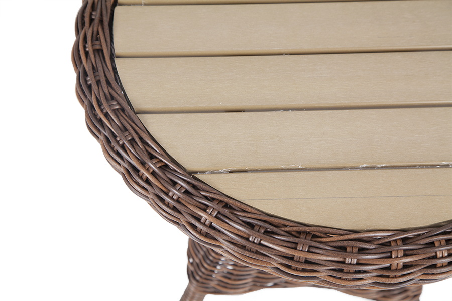 Столик "Равенс" может использоваться как в роли кофейного, так и в качестве детского обеденного стола, в комплект к которому подходят детские кресла из этой серии. Размер модели – 600×600×480 мм. Столик располагает прочным каркасом, который изготовлен из качественного алюминия, отвечающий за надежное расположение конструкции. Весь каркас оплетен вручную круглым искусственным ротангом коричневого цвета. Рабочая поверхность столика выполнена из древесно-полимерного композита - ДПК. Материал обладает высокой износостойкостью и прочностью в ходе эксплуатации.