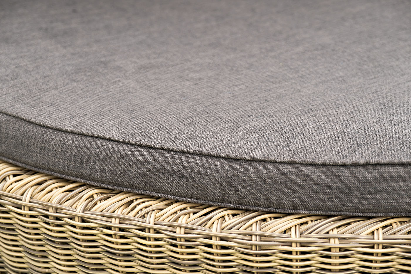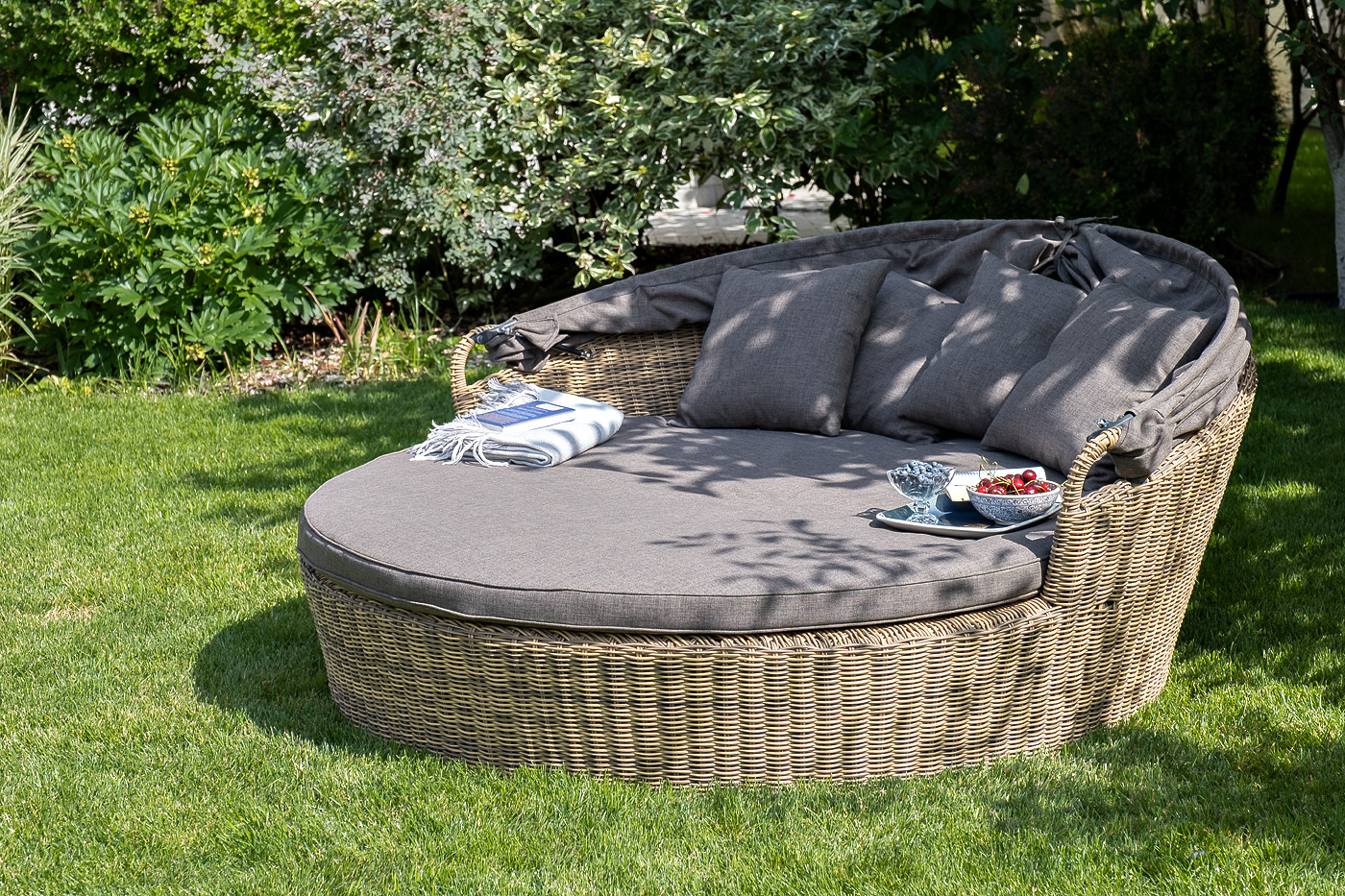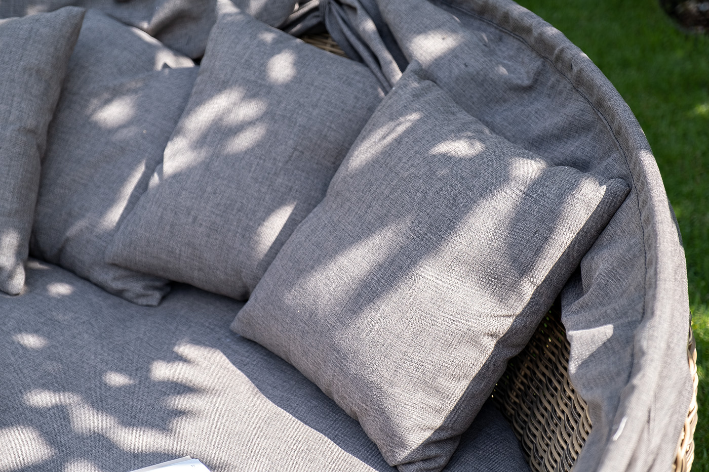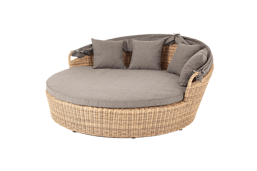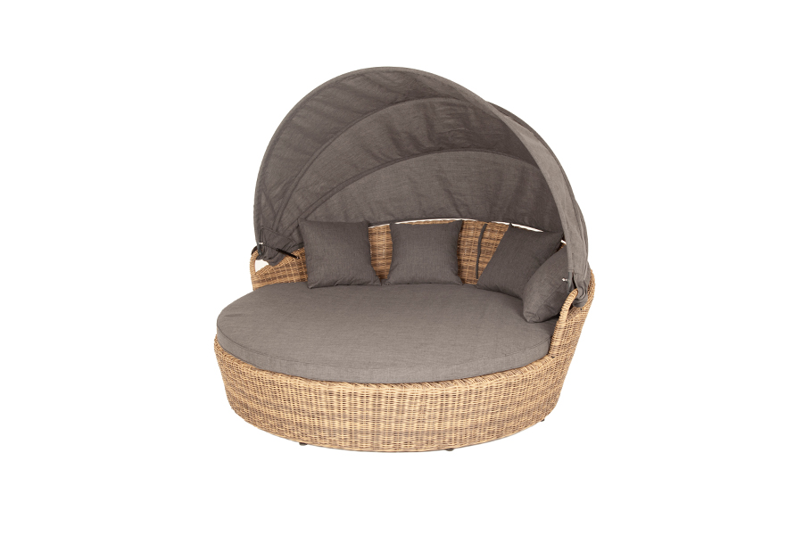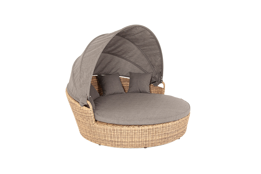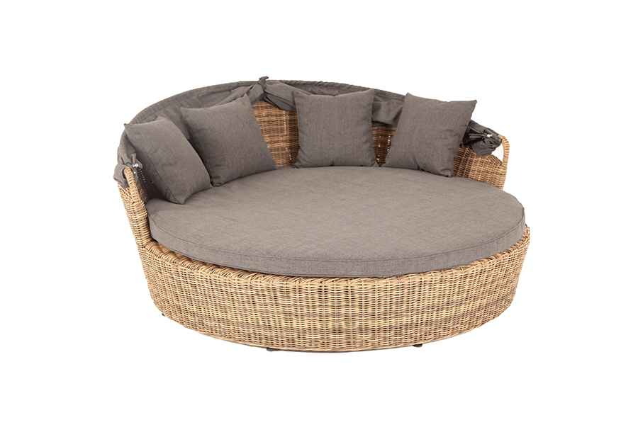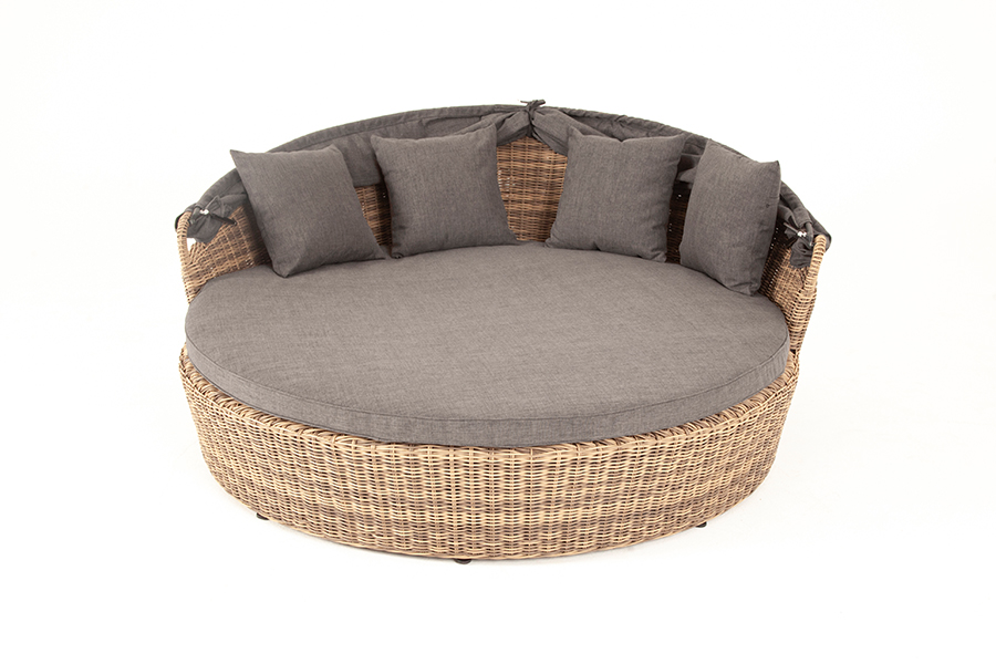 «Стильяно» - кровать из искусственного ротанга круглой формы. Она идеально подойдет для использования на открытом воздухе, в том числе и возле бассейна. Имеет соломенный оттенок. Функциональная круглая кровать высотой в 700 мм и диаметром в 1800 мм выполнена плетением вручную из искусственного ротанга. Конструкция усилена алюминиевым каркасом. Козырек откидывающийся, выполнен из водостойкой полиэфирной ткани. Мягкий матрас имеет съемный чехол серо-коричневого цвета, подлежит машинной стирке.