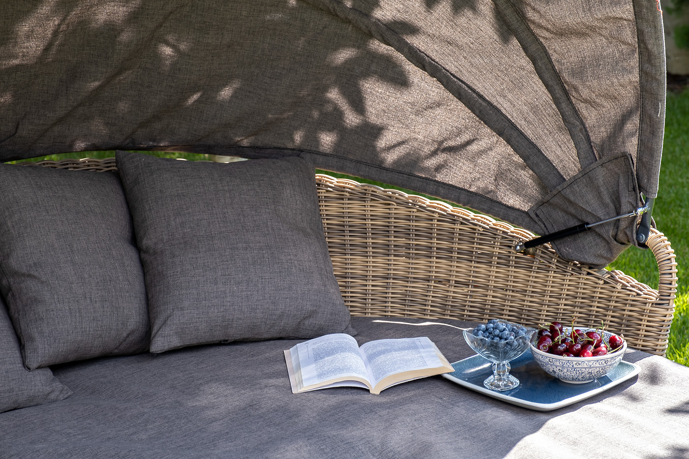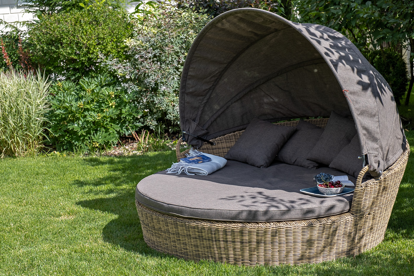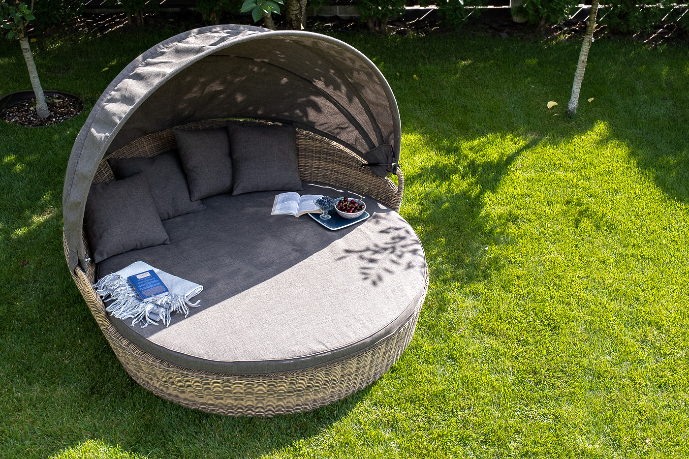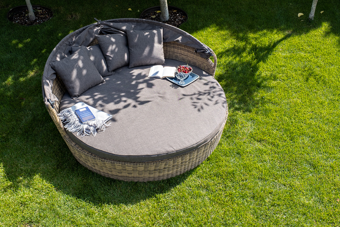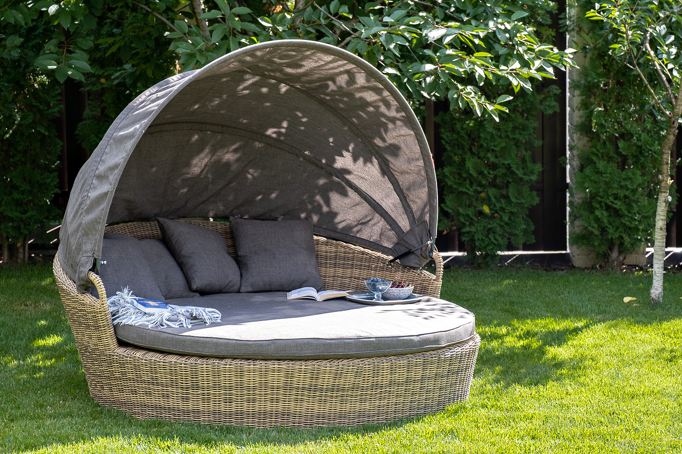 «Стильяно» - кровать из искусственного ротанга круглой формы. Она идеально подойдет для использования на открытом воздухе, в том числе и возле бассейна. Имеет соломенный оттенок. Функциональная круглая кровать высотой в 700 мм и диаметром в 1800 мм выполнена плетением вручную из искусственного ротанга. Конструкция усилена алюминиевым каркасом. Козырек откидывающийся, выполнен из водостойкой полиэфирной ткани. Мягкий матрас имеет съемный чехол серо-коричневого цвета, подлежит машинной стирке.