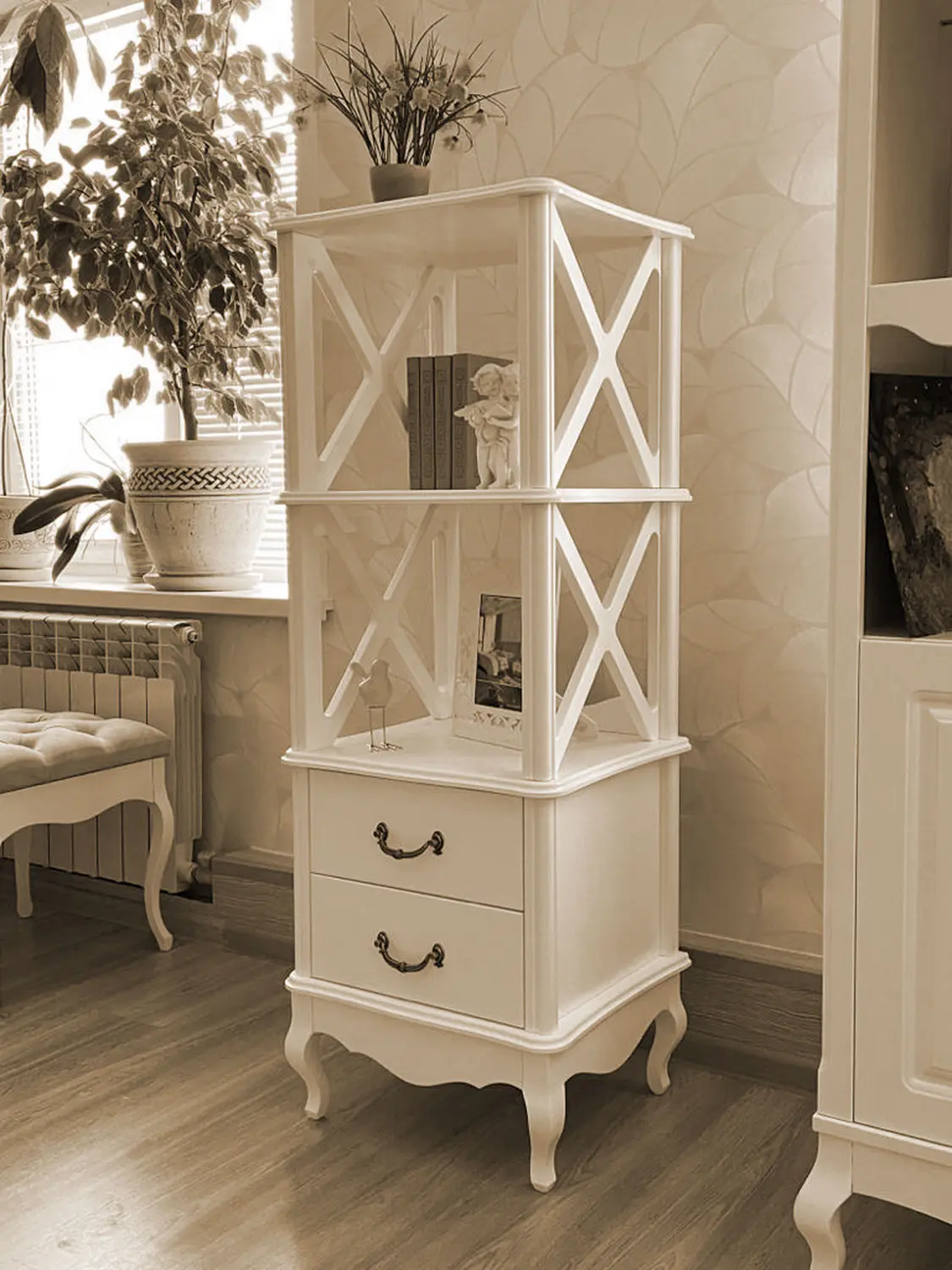 Функциональная, воздушная и универсальная этажерка с двумя выдвижными ящиками и полками.